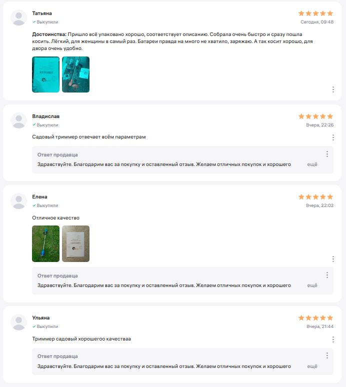 Отлично справляется с подрезкой травы и кустарников, работает тихо и удобно в использовании. Мощный и легкий в управлении - даже длительная работа не вызывает усталости. Батарея держит достаточно долго, чтобы обработать всю территорию, а зарядка занимает немного времени. Отличный инструмент для ухода за садом, который значительно облегчает работу и делает её более приятной.
